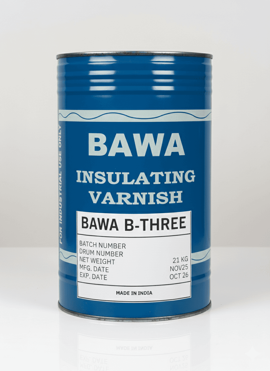 BAWA B-THREE is an advanced impregnating varnish formulated for reliable Class B (130°C) insulation in small motors, precision coils, and light-duty electrical equipment. It offers uniform penetration, clean film formation, and stable curing, making it ideal for densely wound assemblies and compact motor structures. Its formulation ensures long-term electrical protection, mechanical stability, and smooth insulation finish across various applications.