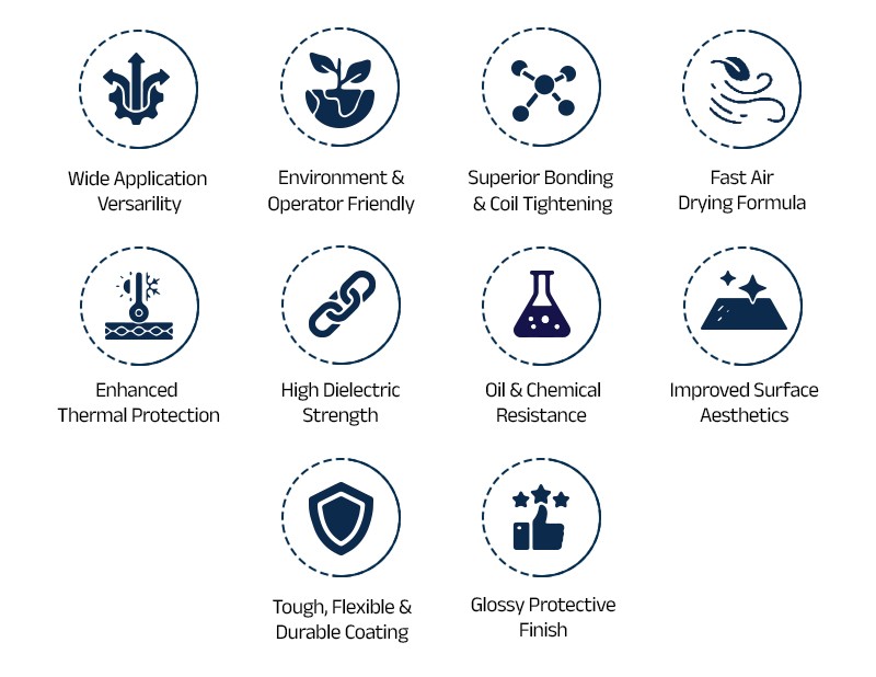 Our varnishes are suitable for: • Motor windings • Transformer coils • Alternators and armatures • Field coils • Electrical components requiring dielectric coating